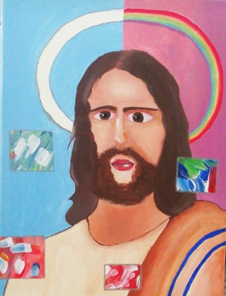 Auf der Leinwand wird der ideale Jesus abgebildet. Die linke Seite symbolisiert den Himmel, das Göttliche und die biblisch-christliche Vorstellung des Glaubens. Die rechte Seite des Bildes zeigt, wie ich mir die Zukunft des Glaubens vorstelle und wie auch die Modernisierung unseren Glauben beeinflussen könnte. Anstatt eines Heiligenscheins wird auf dieser Seite ein Regenbogen abgebildet, da sich immer mehr Menschen der LGBTQA+ Community zugehörig fühlen und der symbolisch für das Zeichen des Friedenbundes von Gott mit den Menschen am Himmel abgebildet worden ist (1. Mose 9, 12). Der Glaube soll sie in diesem unterstützen. Das Zusammenspiel der Farben in den Vierrecken symbolisiert das Zusammenleben mit Gott und den Menschen.