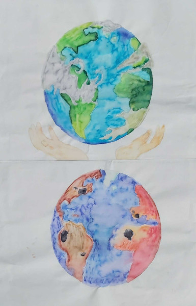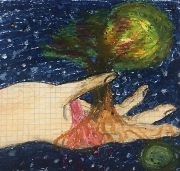 Auf meinem Bild ist zunächst ein offene Hand zu sehen. Diese Hand soll die Hand Gottes darstellen, welche behutsam und vor allem beschützerisch einen Baum hält. Dieser Baum schlingt seine Wurzeln bis zum Finger der Hand und zieht seine Kraft aus ihr. Der Baum soll die Menschheit darstellen welche ihre Kraft aus Gott und seiner Religion zieht. Nicht nur die Kraft, sondern auch die Natur gab uns Gott. So haben wir Pflanzen welche uns Nahrung aber auch Sauerstoff schenken, Tiere welche uns ernähren und Regen welcher uns Wasser zum Leben spendet. All diese Dinge gehören zur Natur welche aus Gottes Hand erschaffen wurden. Des Weiteren hat der Baum verschiedene Blätter welche wiederrum verschiedene Farben haben. Denn Gott liebt jeden Menschen, egal ob groß oder klein, egal welche Farbe. Zusätzlich schuf Gott die Planeten und die Sonne, zusammen mit dem Sternen welche die verstorbenen Seelen darstellen sollen. Ihnen gibt Hott die Chance auch nach ihrem Tod noch auf ihre Liebsten zu achten. Das Blut welches aus der Hand strömt zeigt die Sünden welche manche Menschen in Gottes Namen verrichten: ,,Der Mensch verliert immer mehr seiner selbst und löst sich so immer mehr vom Glauben“ (Nietzsche)