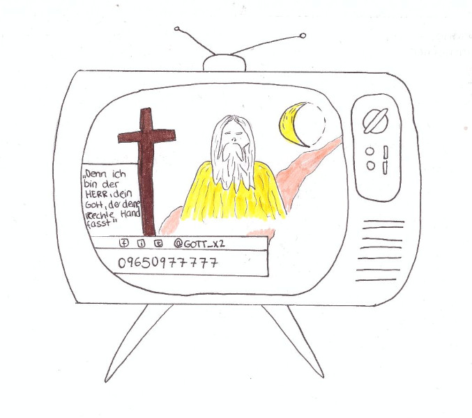 Der an eine Karikatur erinnernde Beitrag zu dieser Ausstellung zeigt einen klassischen Teleshoppingkanal, nur dass es sich hier um ein anderes Produkt als gewöhnlich handelt: Der Glaube und auch Gott, wie wir ihn wahrnehmen und welche Rolle er für uns annimmt. Als Werbung ist der Bibelvers „Denn ich bin der Herr, dein Gott, der deine rechte Hand fasst und zu dir spricht: Fürchte dich nicht, ich helfe dir!“ angegeben. In einer Welt, in der sich die Plattformen ändern, auf welchen über Gott diskutiert wird, und auch die Wahrnehmung der Menschen von Gott, muss die Kirche entweder mitgehen oder bleibt zurück. Veränderungen, grundlegende und weitreichende, gibt es aber seit Beginn der menschlichen Zivilisation. Eine Herausforderung folgt der nächsten. Dieses Prinzip gilt seit gründen der ersten Kirche. Dabei muss sich nur, als Gläubiger aber auch als Betrachter, die grundsätzliche Frage gestellt werden, wann Eigenwerbung arrogant und die Barmherzigkeit eigennützig wird. Inwiefern muss die Kirche Gott zurechtrücken und ein Bild schaffen, welches locken könnte? Bei dieser Darstellung wird auf das klassische Bild des alten Mannes zurückgegriffen, eng verbunden mit der Figur des Vaters. Jedoch lassen sich keine klaren Strukturen erkennen, da auch erst bei näherer Betrachtung ein konkretes Bild bei intensiver Beschäftigung mit Gott entstehen kann. Doch nicht nur das Wort „Vater“ fällt im Zusammenhang mit Gott. Der Bart und die grauen Haare deuten auch auf eine überholte und eingerostete Vorstellung. Direkt verbunden wird dies allerdings mit den sozialen Medien, das Markenzeichen der jungen Generation.