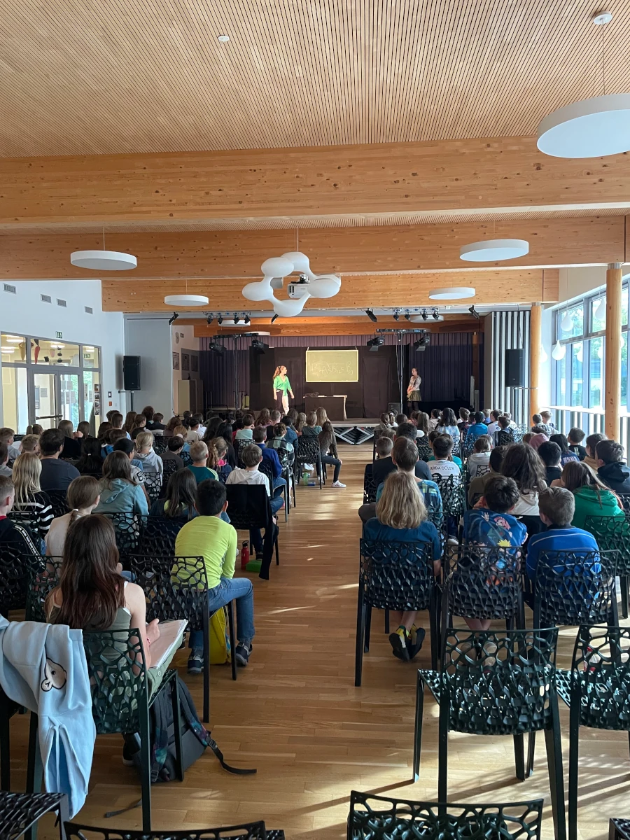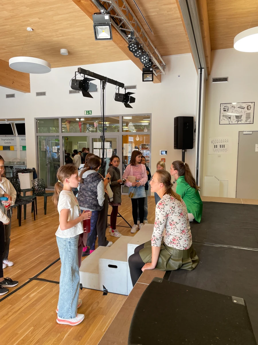 Im Anschluss an die Aufführung gab es noch Gelegenheit für einen sehr lohnenden, unmittelbaren Austausch zwischen den Schauspielerinnen und den Kindern: Sie konnten im Plenum sowohl inhaltliche Fragen zum Stück als auch Fragen rund um die Schauspielerei stellen. Das Interesse der Schüler und Schülerinnen war so groß, dass nach dem offiziellen Ende noch viele weitere Fragen im Einzelgespräch mit den Schauspielerinnen gestellt wurden.