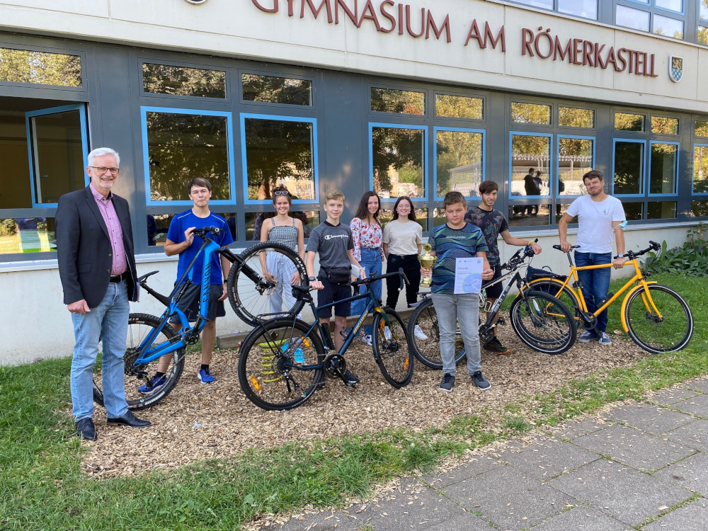 Stolz nahmen nun die vier fleißigsten Radlerinnen und Radler die Preise für ihren Einsatz entgegen. Geehrt wurde jeweils 1 Schüler mit den meisten Kilometern aus den Klassen 5/6, aus den Klassen 7/8, aus 9/10 und aus der Oberstufe. Die Preise, Gutscheine für den lokalen Fahrradhandel und Sachpreise, stifteten Fahrrad Rosskopp und der Förderverein des Röka.