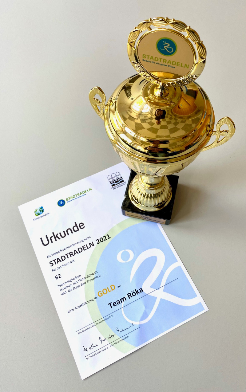 Während der Aktion hat das gesamte Team Röka 7750 Kilometer erradelt und damit weit über eine Tonne CO2 eingespart. Der Nachhaltigkeitsgedanke ist an unserer Schule ohnehin sehr präsent, so dass Lehrer Matthias Magin gemeinsam mit der Schülervertretung schnell zahlreiche Mit-Radler fand: Das Schulteam, bestehend aus SchülerInnen, LeherInnen, Mitgliedern der Schulleitung und einigen Eltern wurde schnell das größte Team der Kommune und landete im Stadtranking bei den gesammelten Kilometern auf Platz vier. Dafür gab es bereits einen Pokal und eine Urkunde von den städtischen Organisatoren.