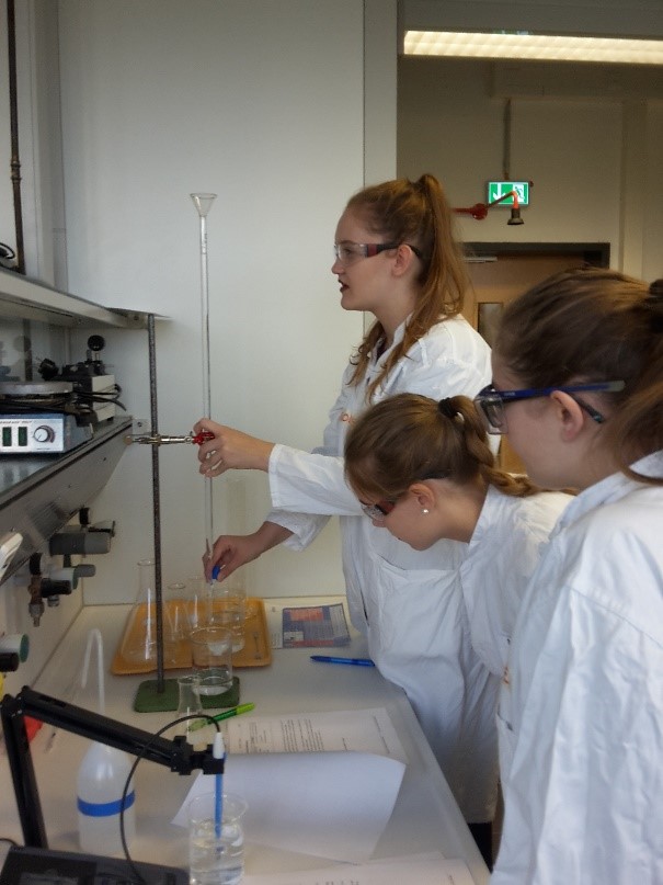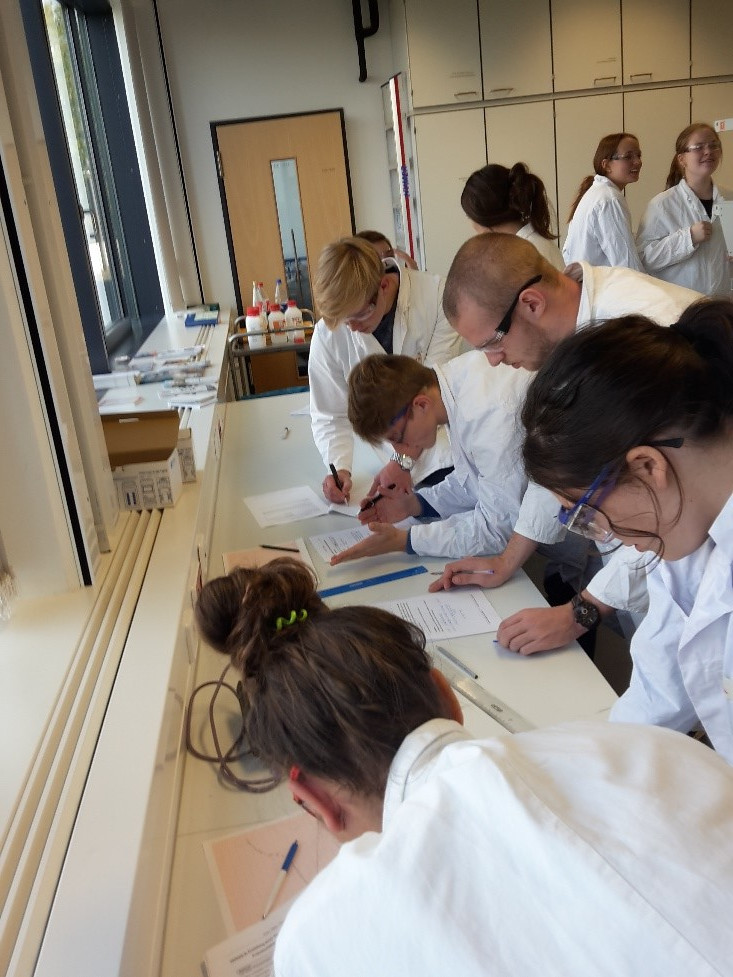 Im Rahmen des Fachs Chemie in der Oberstufe nutzen wir immer wieder die Angebote des Schülerlabors der Universität Mainz. Hier werden zu verschiedenen an den Unterrichtsstoff angeschlossenen Themen Experimentaltage Angeboten, bei denen die Schüler*innen Synthesen und Analysen durchführen und auswerten, die sonst im schulischen Rahmen nicht zu realisieren wären. So können die Schüler*innen dort z.B. verschiedene Verfahren zur Farbstoff- oder Polymersynthese ausprobieren, ihre analytischen Fähigkeiten in verschiedenen Titrationsverfahren schulen oder in Anwendungsbereiche der Nanotechnik oder Lebensmittelzusatzstoffe einsteigen.