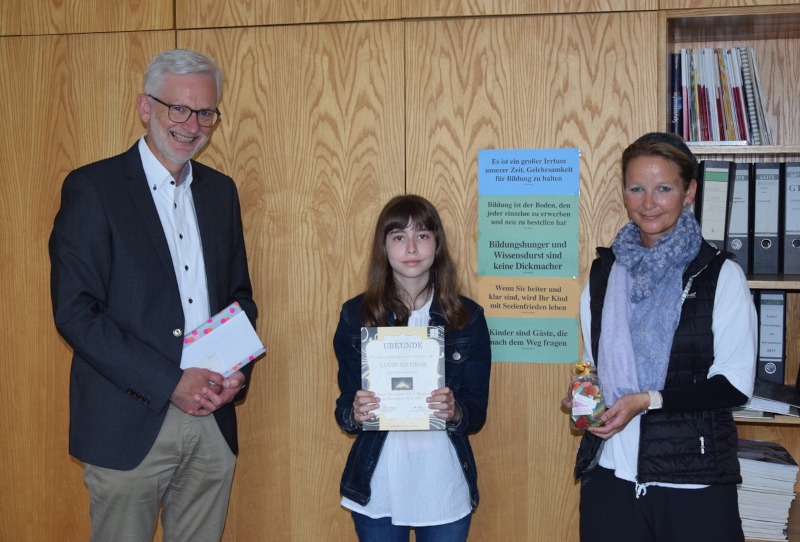 Am Dienstag, 22.6., erhielt Lucie ein Gratulationsschreiben von Bildungsministerin Stefanie Hubig sowie eine Urkunde der Schulleitung und ein Geschenk der Fachhschaft Deutsch.