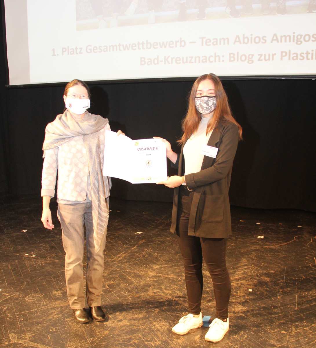 Unglaublich, das Team Abios Amigos des ehemaligen Erdkunde Leistungskurses hat sich vor hochkarätiger Konkurrenz vor den Teams von der Uni Trier und der Technischen Hochschule Kaiserslautern behaupten können und nahm gestern im Kurfürstlichen Schloss in Mainz den Preis von Umweltministerin Ulrike Höfken entgegen. Diese lobte die vielfältigen und innovativen Gewinnerbeiträge. „Die Beiträge sprechen Jugendliche und junge Erwachsenen an, zeigen zum Teil Lösungen auf, um Plastikmüll zu reduzieren, sollen zu nachhaltigem Handeln anregen – und damit Spaß vermitteln“ erklärte Höfken in ihrer Laudatio.