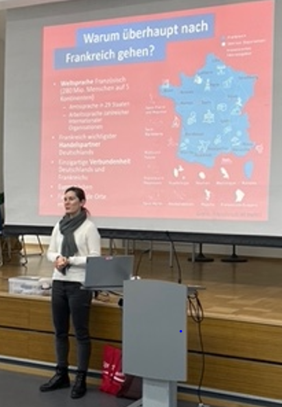 Am 28.11.2022 besuchte Anke Fritsch vom „Maison de Rhénanie-Palatinat“ in Dijon in Burgund die Französischkurse der MSS 11 und 13 und eine 9. Klasse. Sie präsentierte uns verschiedene Mobilitätsprogramme für Jugendliche und junge Erwachsene in Frankreich. Uns wurden unter anderem freiwillige Praktika, Jugendreisen, Auslandsaufenthalte und spannende Ferienprogramme in faszinierenden Orten in Frankreich vorgestellt.