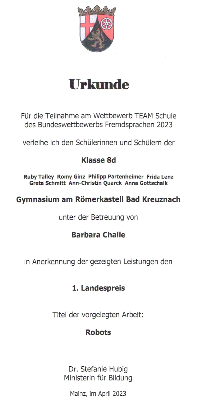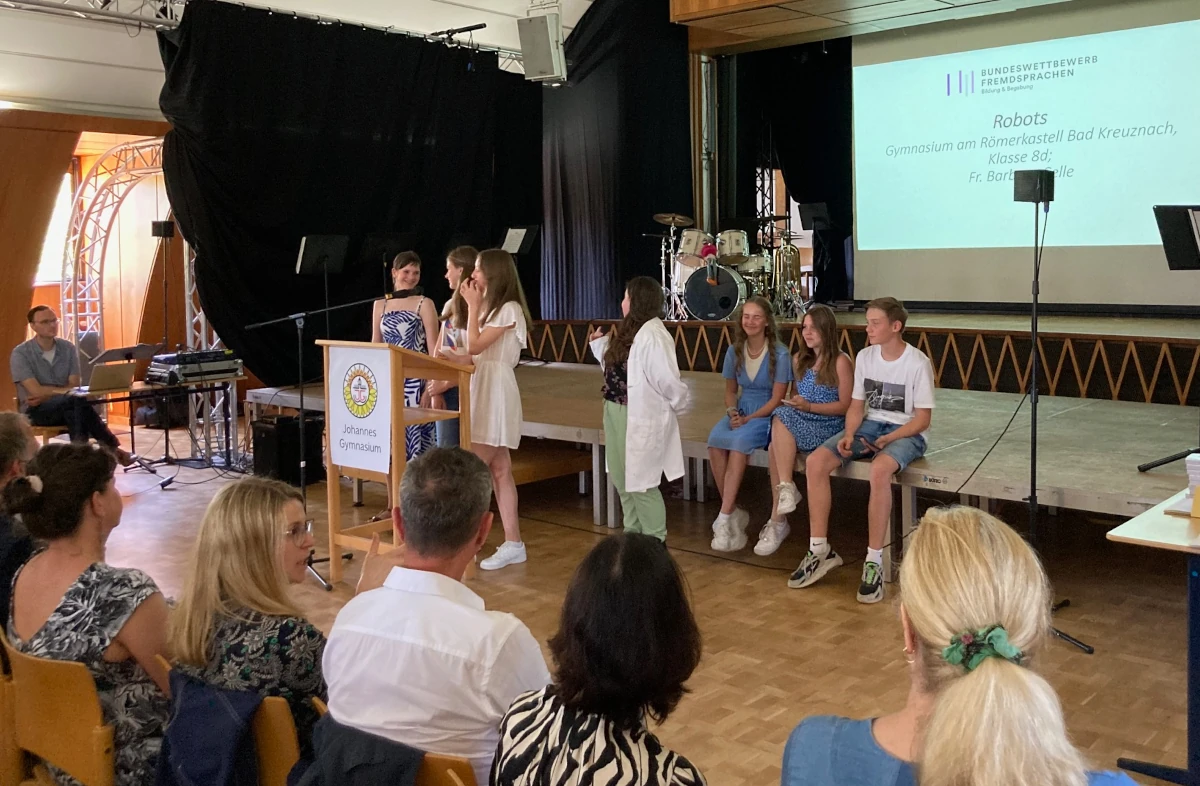Wir - Anna, Ann-Christin, Frida, Greta, Ruby, Romy und Philipp - hatten die großartige Gelegenheit, an einem bundesweiten Fremdsprachen-Wettbewerb teilzunehmen, der von unserer AG-Leiterin, Frau Barbara Challe, intensiv betreut und tatkräftig unterstützt wurde. Nach Wochen des Schreibens eines Drehbuchs und dessen Verfilmung waren wir alle sehr aufgeregt, als wir zur Preisverleihung eingeladen wurden und der Tag, an dem wir unsere Auszeichnung erhalten sollten, endlich gekommen war. Das Besondere am Ausgang des Wettbewerbs war, dass wir den ersten Platz erreicht hatten. Wir wurden mit Applaus auf der Bühne empfangen. Es war ein stolzer Moment für unser Team und wir hatten das Gefühl, dass sich all unsere harte Arbeit und Anstrengungen gelohnt hatten. Als Anerkennung für unseren Erfolg erhielten wir Urkunden und ein Preisgeld.