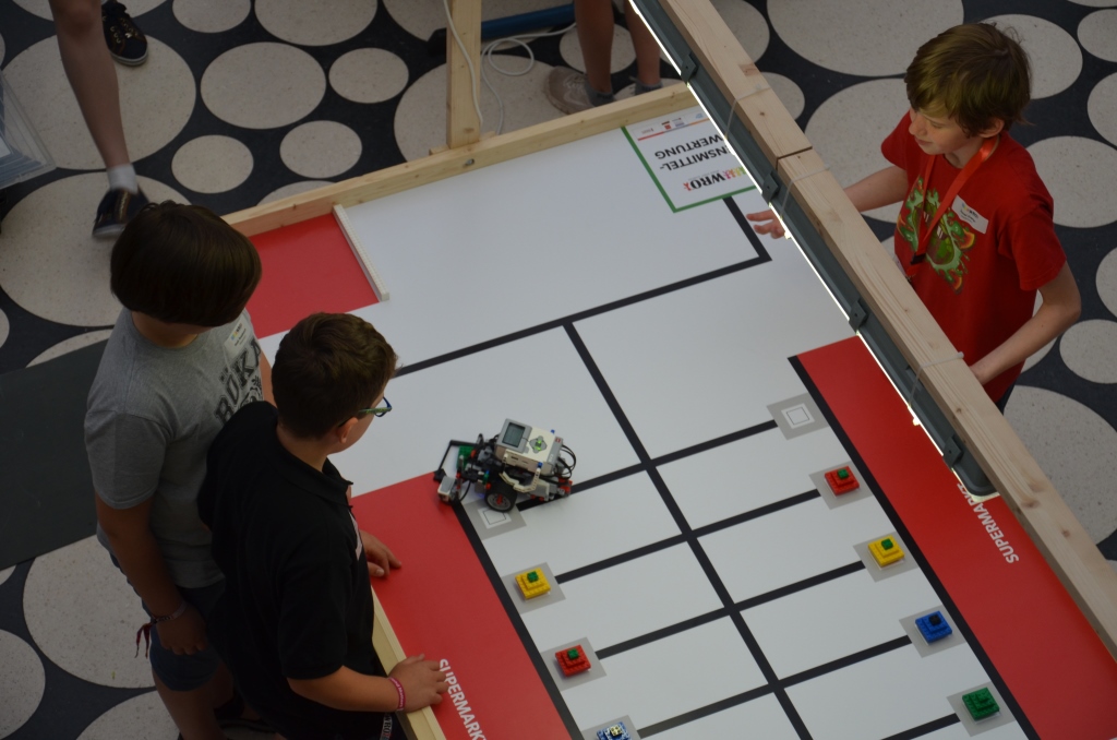Am Wettbewerbstag musste zuerst der Roboter vor Ort komplett ohne Anleitung zusammengebaut und dann die Programmierung auf die dortigen Gegebenheiten (z.B. Lichtverhältnisse) angepasst werden. In vier Wettebwerbsläufen à 2 Min. konnten die Teams dann zeigen, was ihr Roboter leisten konnte. Nach jeder Runde gab es Umbau- und Programmierphasen um die Leistung weiter zu verbessern.