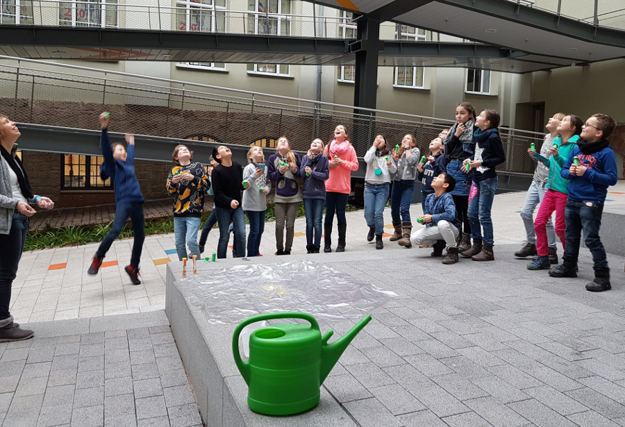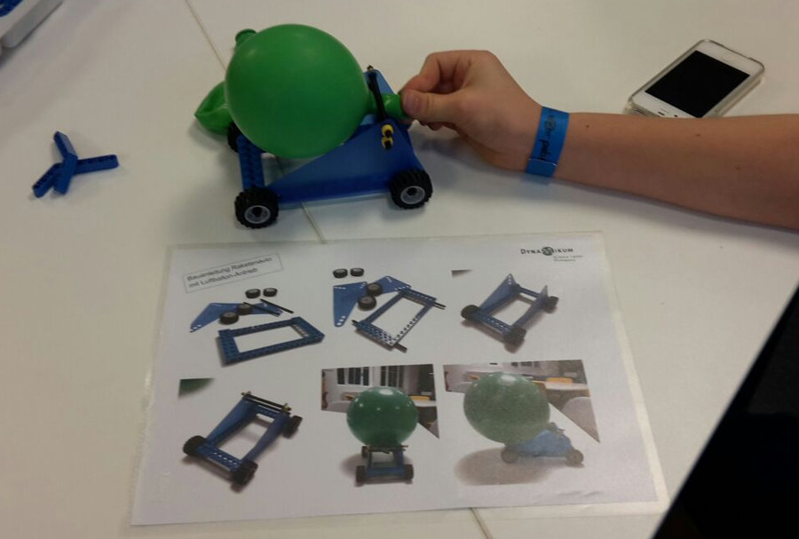 Nach einer kurzen Pause besuchten wir einen Workshop (das ist sozusagen Unterricht). Der Workshop hatte das Thema „Rückstoßprinzip“ (wir drücken uns von der Erde ab). Wir bauten ein Auto aus Lego, das sich mit Hilfe eines Luftballons fortbewegte und anschließend bastelten wir eine Rakete, die draußen mit Brause und Wasser hochflog.