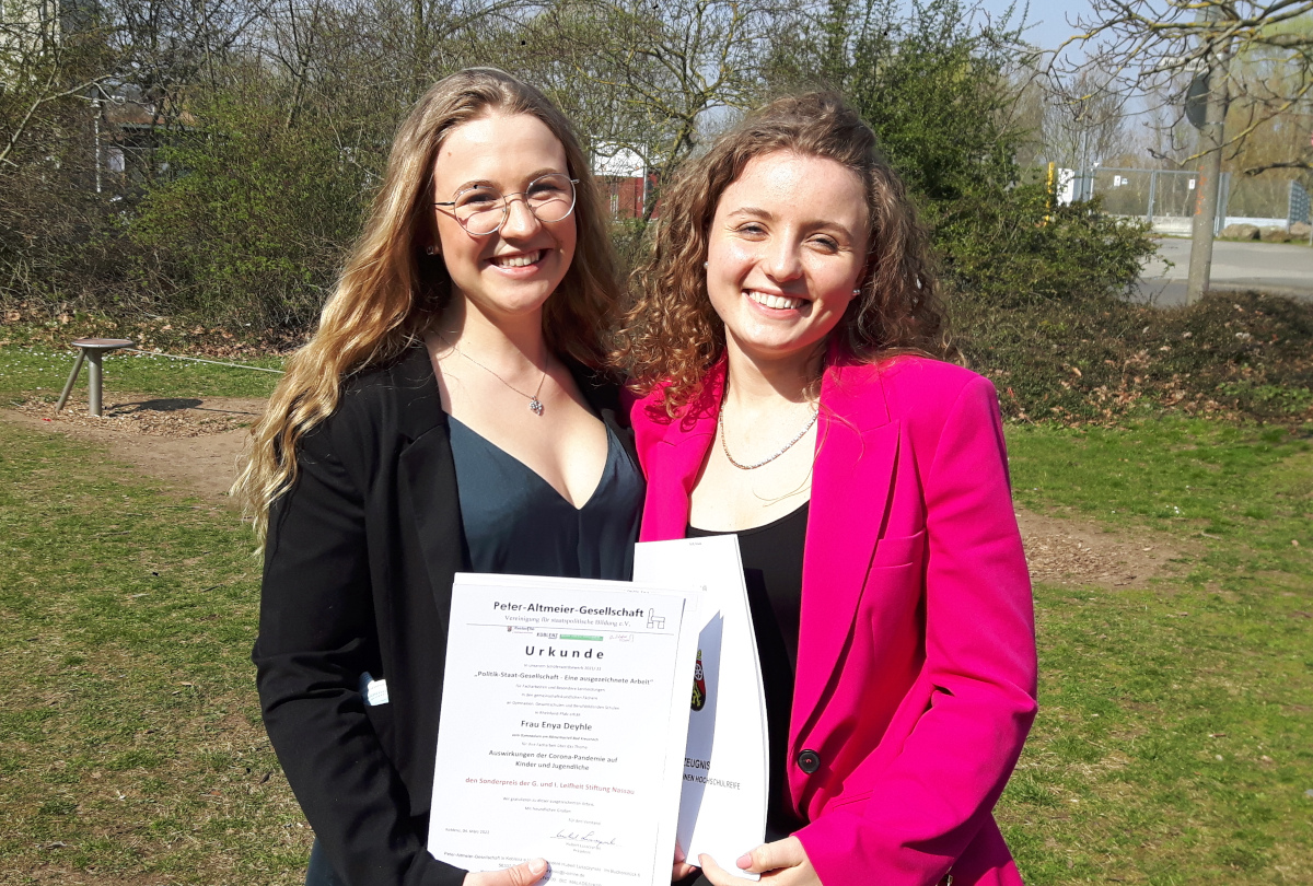 Mit ihren Abiturzeugnissen erhielten Enya Deyhle und Paula Kadel Urkunden der Peter-Altmeier-Gesellschaft. Beide hatten ihre ausgezeichneten Facharbeiten als Wettbewerbsbeiträge zu den Themen „Politik – Staat – Gesellschaft“ eingereicht.