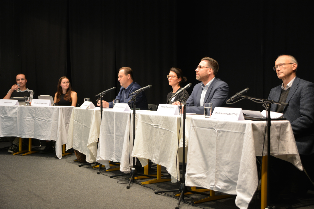 Auf Einladung der Schüler stellten sich Lisett Stuppy (B90/Grüne), Michael Simon (SPD), Dr. Helmut Martin (CDU) und Philipp Fernis (F.D.P.) den Fragen der Schüler. Elisabeth Hegemann und Max Schmitt moderierten nahezu professionell die inhaltsreiche Debatte, die trotz einiger kritischer Fragen von gegenseitigen Respekt und Ernsthaftigkeit der Bürgervertreter geprägt war.