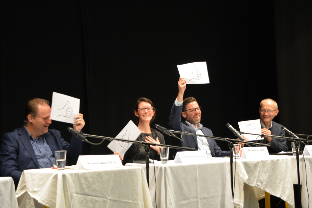 „Daumen hoch“ oder „Daumen runter“? Michael Simon (SPD), Lisett Stuppy (B90/Grüne), Philipp Fernis (F.D.P.) und Dr. Helmut Martin nahmen im Gymnasium am Römerkastell zu kritischen Fragen der Kinder Stellung. Fotos: Kai Sieben