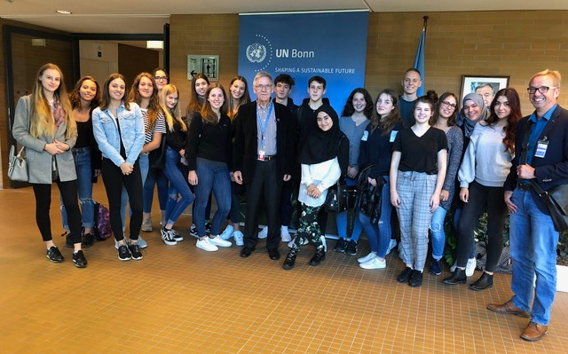 Der Stammkurs 11 Sozialkunde von Herrn Franke erhielt eine ausführliche und überaus interessante Tour über den UN-Campus. Die Führung sowie eine ebenso spannende Präsentation und Diskussion über die zentralen Handlungsfelder der Vereinten Nationen verdanken wie Herrn Botschafter Prinz, der lange Jahre v.a. in in Afrika arbeitete und uns auf Initiative von Herrn Franke einlud. Nachdem um 06:15 sich der Kurs vor der Schule versammelt hatte, ging es mit dem Bus nach Bonn. Nach etwa 2 Stunden erreichten wir Gronau, einen Stadtteil südöstlich der Bonner Innenstadt. Nach einer interessanten Audio-Tour durch das Haus der Geschichte begaben wir uns zum Platz der Vereinten Nationen, wo wir den ehemaligen Diplomaten und engagierten Mitarbeiter Herrn Prinz trafen, der uns zu Beginn den UN-Campus zeigte.
