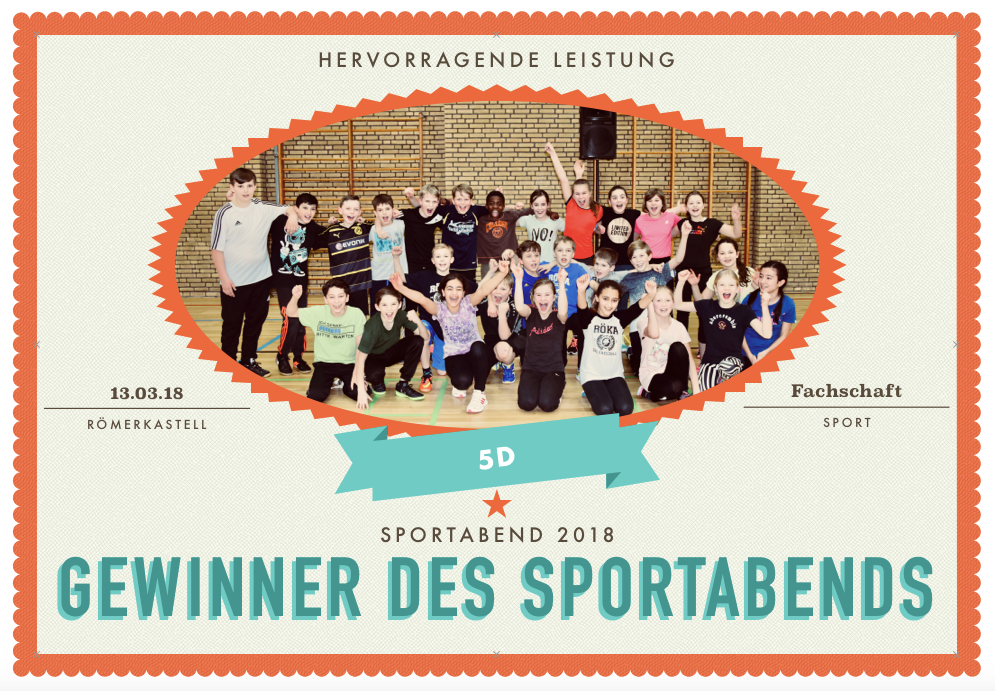 Am 13.03.2018 fand ein Sportabend in der großen Sporthalle des Röka statt. Alle 5. Klassen waren beteiligt und kämpften in den Sportarten Rope Skipping, Bodenturnen und Parteiball um den Klassensieger. Beim abschließenden Pendelstaffellauf wurden die Kinder noch einmal kräftig von den Zuschauern unterstützt. Sieger des Abends war die Klasse 5d. Über den Preis, einen kompletten Sporttag, haben sich die Kinder sehr gefreut.