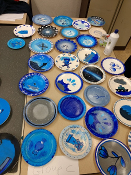 Zuerst war Kunst an der Reihe, hier konnten wir unserer Kreativität freien Lauf lassen und hatten die Aufgabe, Teller mit vorwiegend blauen, grauen, weißen und schwarzen Farben zu gestalten. Um uns das Ganze etwas zu erleichtern wurden uns vorher ein paar Beispiele vorgestellt. Eine Besonderheit war, dass man die Teller in Partnerarbeit mit seinem Austauschschüler bemalen sollte, und am Ende eine Gemeinsamkeit zwischen den Tellern erkennen musste. Wir haben uns alle mächtig ins Zeug gelegt, was sich auch am Ende in den schönsten Gestaltungen widergespiegelt hat.