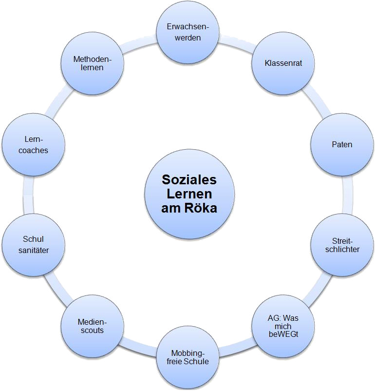 Neben dauerhaften Angeboten von unserer Schulsozialarbeiterin Frau Merker (sie arbeitet mit einzelnen Schülerinnen und Schülern, kleineren Gruppen oder auch tageweise mit ganzen Klassen), unseren Verbindungslehrern sowie den Klassenpaten gehen folgende Konzepte bei uns am Röka „Hand in Hand“: